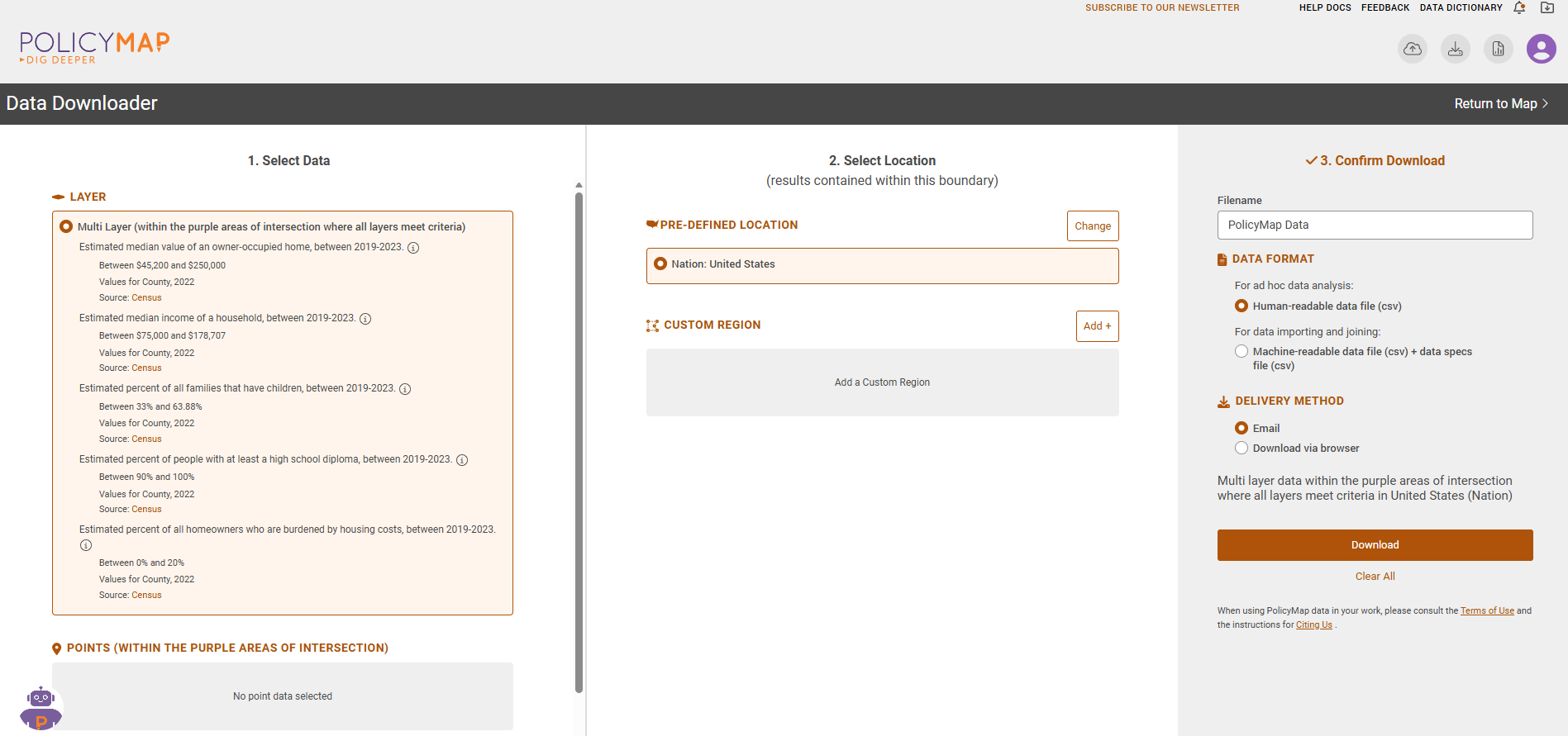 Data Download Modal ![]() | Premium subscribers can use the Data Download Modal to download for the US or any place in the country in file formats that can be used to build your own database or directly input data into another tool or software. | 2022 |